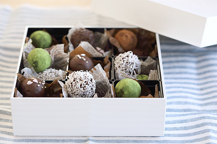 DEAN & DELUCAのお重は2段目が9個の小さなカップで仕切られているので、そちらを使うと食べるときにカップごと取り出してそのままトリュフをつまむことができるので便利です。